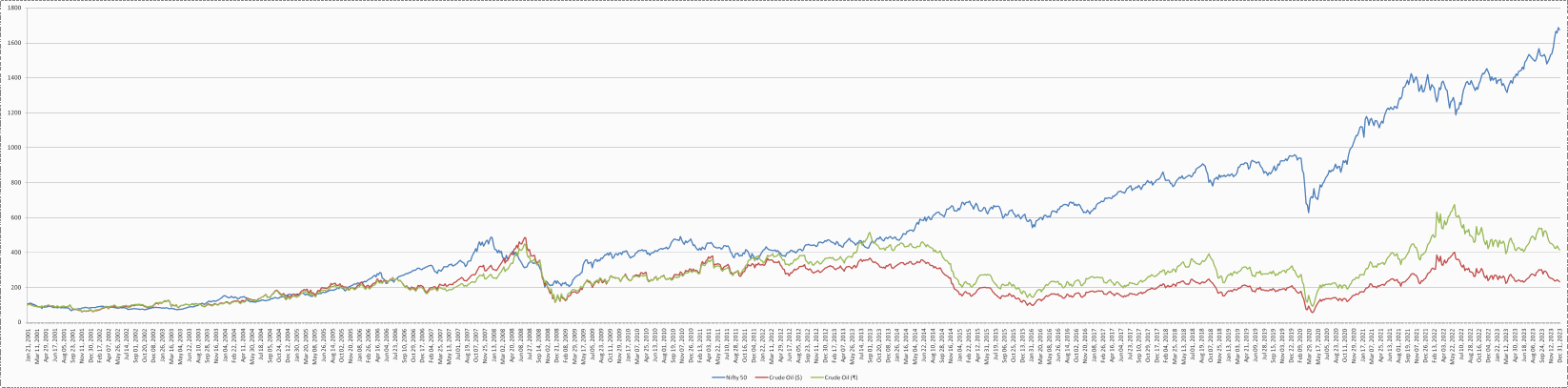 Analysing the data of Nifty 50 index and crude oil price movements for the past two decades, we could summarize two things quite clearly: